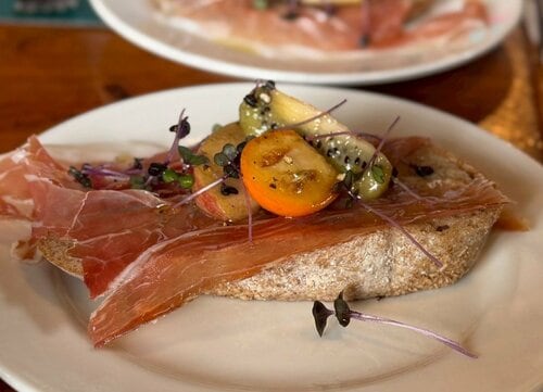 前菜の2品目は、薪窯で焼いたパンの上に生ハムとフルーツのマリネがのったもの。この日のフルーツはりんごとキウイと金柑でした。ナイフとフォークで切ってパンと一緒にいただきます。パンはしっとりとして香り高く、金柑の力強い甘酸っぱさが気に入りました。