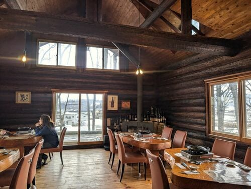 立派なログハウス風の建物は、現オーナーとそのお父様で手作りしたそう。天井が高く、天窓にステンドグラスがある素敵な雰囲気です。
