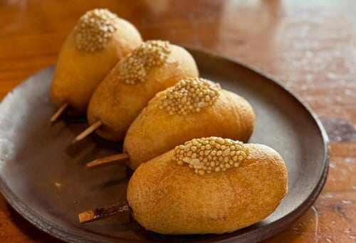 串に羊のソーセージを刺し、その周りを生地でくるんだアメリカンドッグのようなお料理。ふわふわでほんのり甘みのある生地の中に、羊のうま味が詰まったソーセージが入っています。粒マスタードとの相性も抜群。