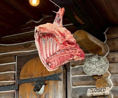予約した11時より少し前に到着するとまだ扉は閉まっていて、立派な枝肉がドアの前にぶら下がっていました。早くも期待が高まります。