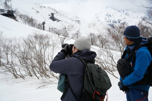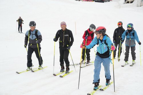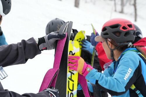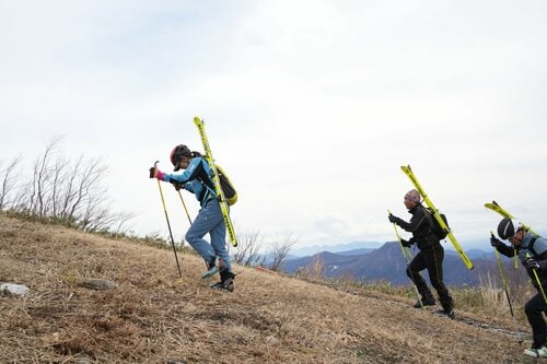 そのSKIMOを谷川雪山フェスで体験。日本山岳・スポーツクライミング協会の協力のもと、スキー、シール、ブーツ、ヘルメット、バックパックが用意され、参加者たちは普段のアルペンスキーとは比較にならないほどの軽さに驚き、シールを付けてのハイクなど、オリンピックさながらの雰囲気を悪戦苦闘しながらも楽しんでいる様子。