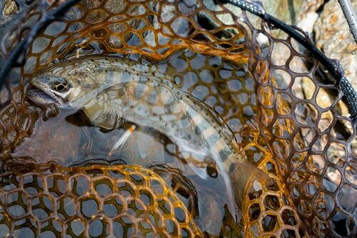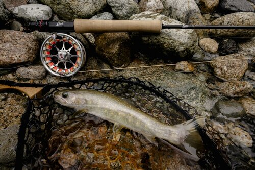 大岩がいくつも転がる合間を水が流れています。泡立つ反転流のなかにじっくりと沈めたソフトハックルが3回転ほどしたとき、グンとラインが吸い込まれました。テンションを保ったまま、今度はどうにかネットまで導くことができました。白っぽいイワナは川床の色によく馴染んで透明感があり、この渓の景色そのものでした。