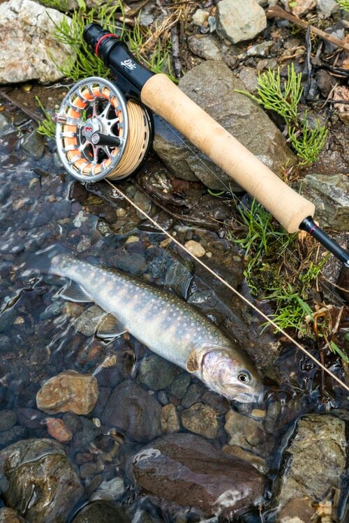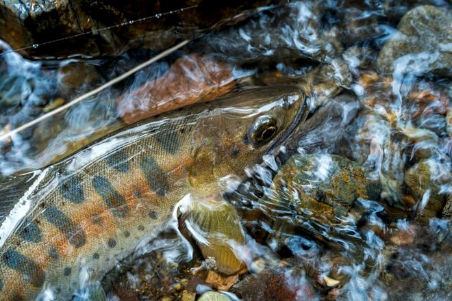 当然のようにライズもなく、先行するルアーマンの後からフックをガイドにかけたまま付いていきました。対岸の古ぼけた石積みの護岸の際に、いくつか石が沈んでいるのが気になります。沈めたフライをじっくりと流していくと“根掛かり”のような鈍いアタリ! まず出迎えてくれたのはイワナでした。